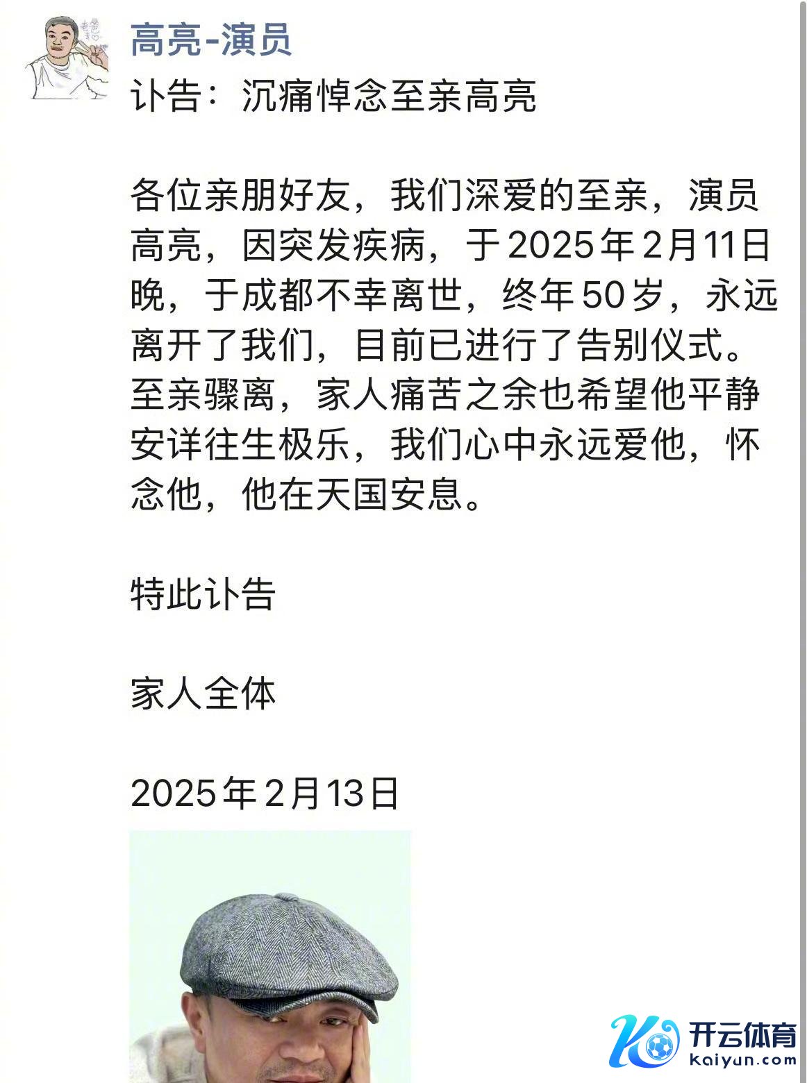 高亮的离世九游体育app娱乐讯息来得太蓦地了,2025年2月11日晚上,他在成齐悄然离开了这个全国,享年50岁,这个年龄对许多东谈主来说恰是行状的黄金期,可他却长期停留在了这一刻,再也无法链接他的演艺行状了,果然令东谈主唏嘘不已。家东谈主在13日发布了讣告,制片东谈主谢晓虎也转发阐述了这个讯息,让通盘这个词演艺圈齐战抖了,民众齐不敢征服这是真的,毕竟前不久他还在片场劳苦,谁能预料生命就这样如丘而止了呢。突发疾病夺走了他的生命,也给咱们敲响了警钟,健康真的太遑急了,无论是演员如故泛泛东谈主,齐应该多关注我方的体格景色,如期体检,珍重体格。